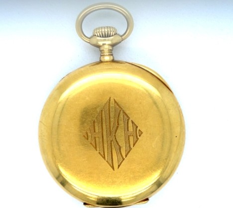 seconds subdial, and gilded hour and minute hands. The back case is engraved “HKH.”