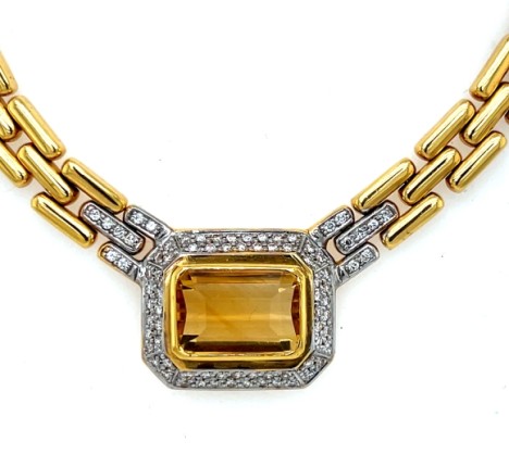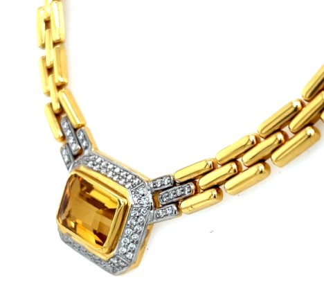 Ca. 1980's 18K Yellow Gold Made in Italy Citrine & Diamond Necklace. 1 center rectangular