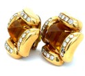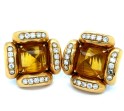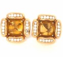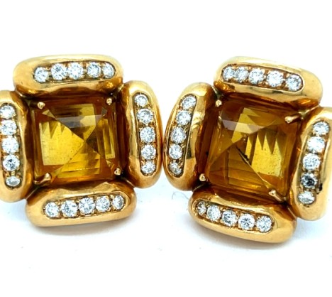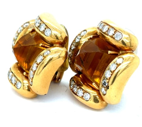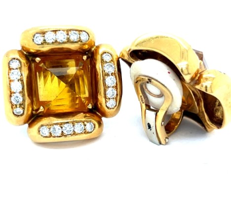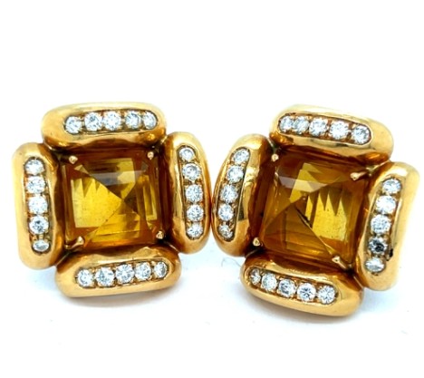 18K yellow gold Citrine & Diamond Earclips contain 2 center pyramid shaped citrines