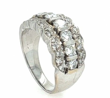 Ring contains 7 gemlock set round brilliant diamonds totaling approx. .70ct, H/SI2 quality,