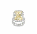Presenting an exquisite masterpiece, the Important Platinum & 18K Natural Fancy Yellow Diamond Ring boasts an elegantly elongated 8.09 carat radiant cut diamond of remarkable quality (VS2 clarity), the central diamond's impeccable craftsmanship adds to its allure.