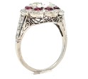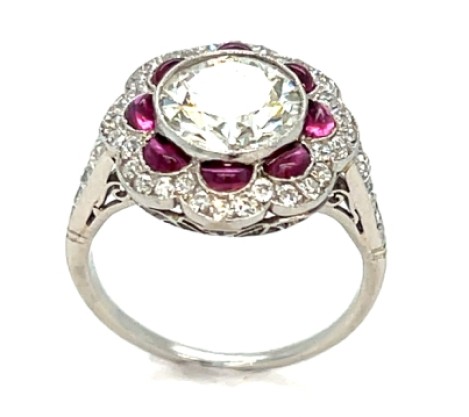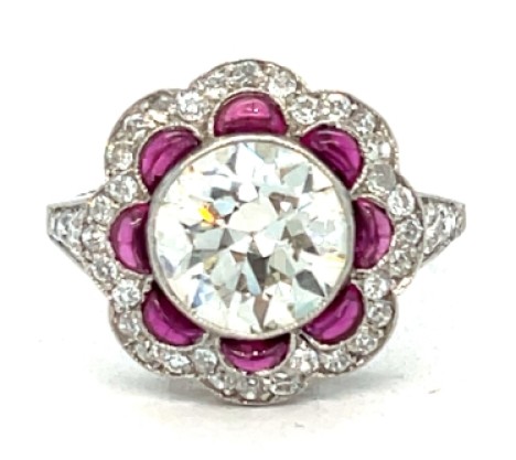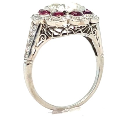 Art Deco platinum diamond and ruby engagement ring, size 4 1/4–4 1/2 scant with a 1mm tapered diamond shank. Centering a bezel-set old European cut diamond weighing ~1.50 carats of J–K/VS quality, surrounded and flanked by ~0.60 carats of additional old European cut diamonds of similar quality. Accented with 8 cabochon half-moon rubies. Total weight: 2.3 dwts.