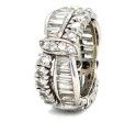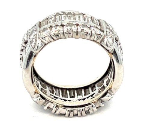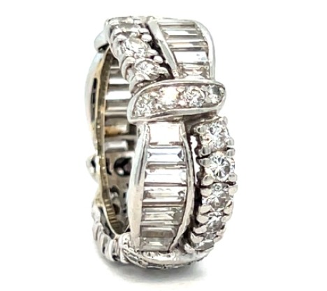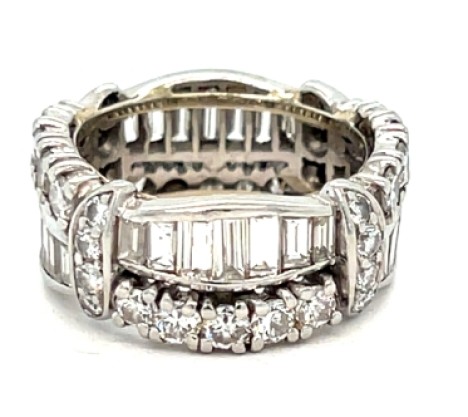 Retro platinum diamond eternity band, size 5 with an 8.5–9mm width. The band is set with 36 individually set round brilliant-cut diamonds and 28 channel-set straight baguettes, totaling ~3.75 carats of H/VS quality. Total weight: 6.0 dwts.