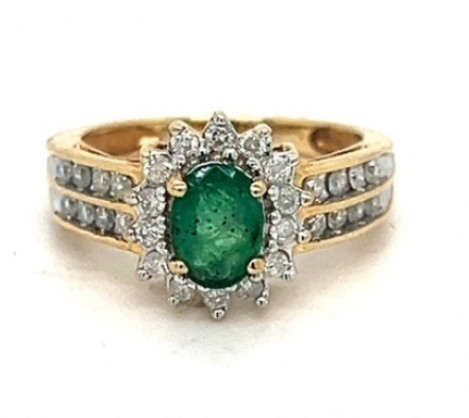 14k yellow gold cocktail ring adorned with a combination of emerald and diamonds. This ring, sized at 5.5, features a graduated 2mm shank. The centerpiece is an approximate 0.60ct. natural oval emerald with fair to good intensity and transparency. The emerald is flanked and surrounded by 30 round brilliant-cut diamonds totaling approximately 0.60ct, set in a combination of channel and prong settings, with a H-I color and SI2 clarity. The top of the ring measures approximately 1/2 inch long by 3/8 inch wide.