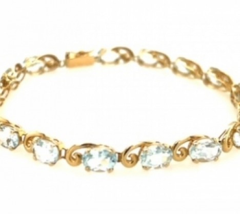 14k yellow gold line bracelet features a classic scroll design adorned with 16 light blue oval topaz gemstones.