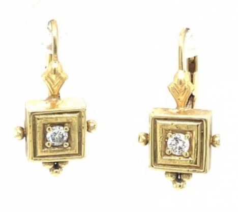 securely set in four-prong yellow gold settings. Equipped with hinged lever friction backs for a secure