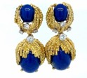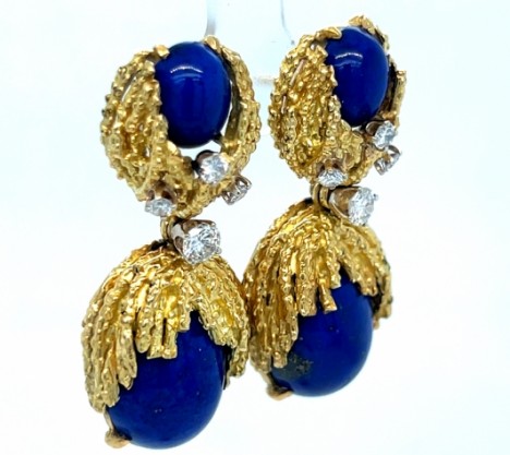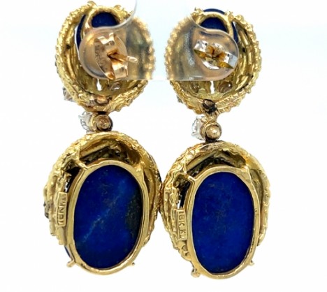 Each earring is set with vibrant lapis panels accented by 8 round brilliant-cut diamonds totaling approx. 0.85 carats,