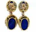 Pair of abstract brushed 18k yellow gold lapis and diamond drop earrings featuring bold geometric design.