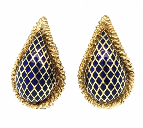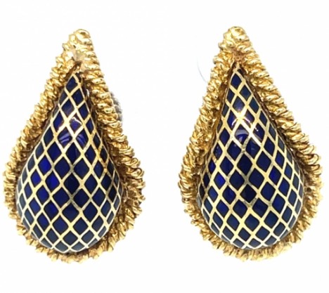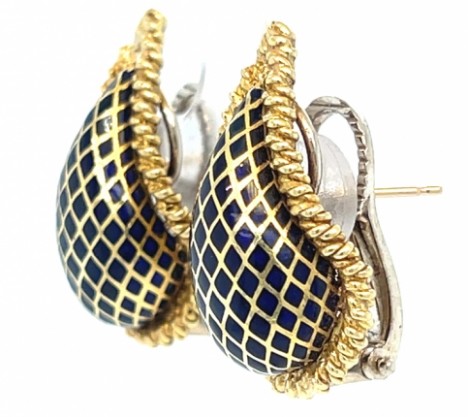 Pair of 18k yellow gold teardrop earrings featuring a striking blue enamel crisscross motif framed by roped edges.
