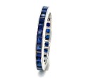14k white gold sapphire eternity band, size 6 1/2 with a 2.5mm width, channel set with natural square-cut sapphires totaling ~0.75 carats, displaying medium blue color and good transparency. Total weight: 1.1 dwts.