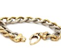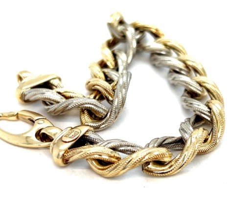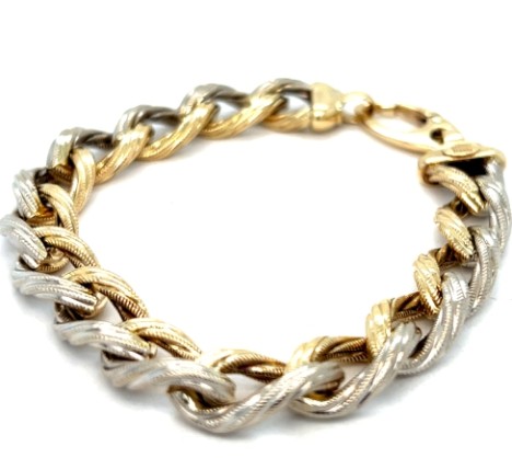 Italian two-tone 14k gold slotted oval link bracelet, 8" long and 7/16" wide, featuring an extra-large tension lobster clasp. Total weight: 8.8 dwts. Excellent condition.