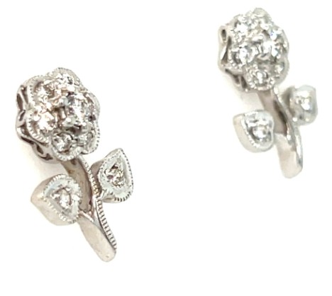 Dainty 14k white gold diamond flower earrings, these earrings contain 18 round brilliant cut diamonds totaling ~ 0.55cts. These diamonds are approximately H-I/SI1-2 quality and measure approximately 11/16" long x 7/16" across the petals, friction posts and backs. 2.3 dwt.