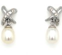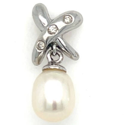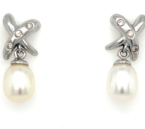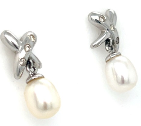 Pair of 14k white gold diamond and pearl "X" drop earrings, each set with 6 round brilliant-cut diamonds totaling ~0.10 carats of I/SI1 quality. Accented with pearls measuring approximately 7 x 9mm, light cream-white in color with good luster and minimal blemishes. Earrings measure approximately 3/4" long. Total weight: 2.2 dwts.