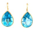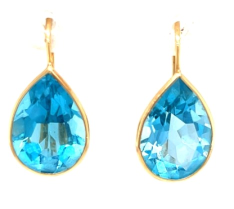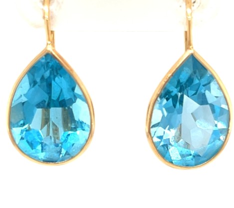 Pair of 14k yellow gold blue topaz teardrop earrings, each set with a deep blue pear-shaped topaz