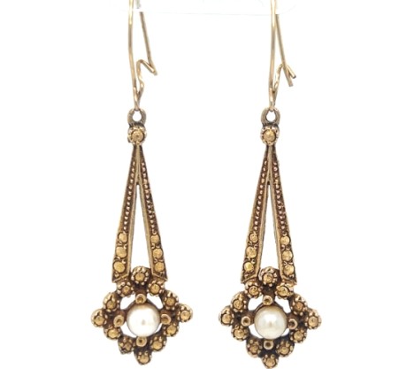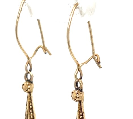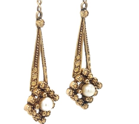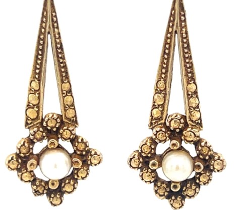 Vintage Y. De Lima & Co. Ltd., Trinidad — 10k yellow gold handcrafted rivet and bead pearl drop earrings,