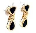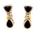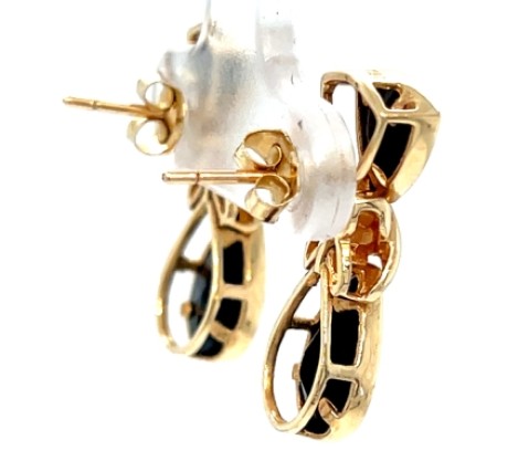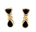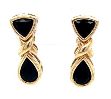Pair of 14k yellow gold earrings featuring an “X” motif above onyx shield and teardrop elements.
