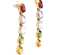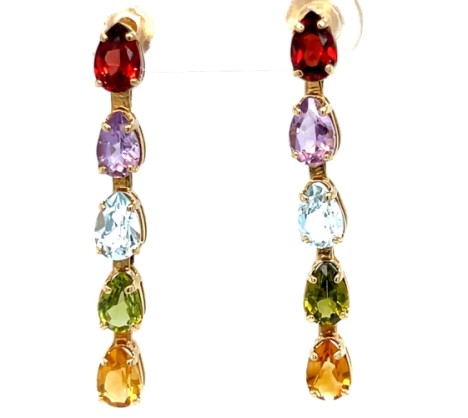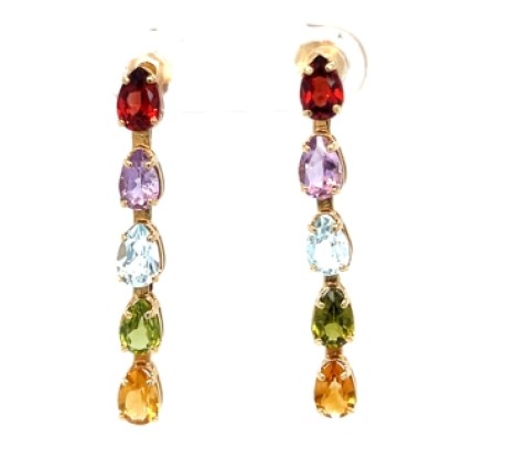 Pair of 14k yellow gold teardrop earrings featuring a vibrant mix of semi-precious gemstones including garnet,