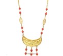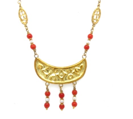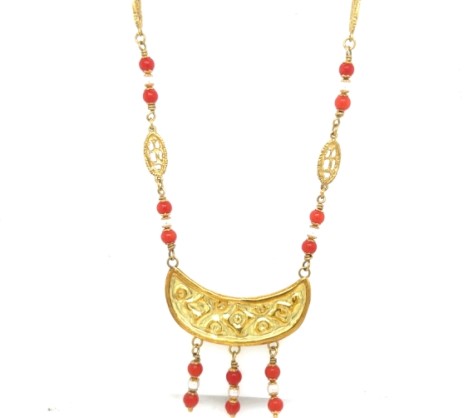 Charming 18k yellow gold necklace featuring red coral beads and seed pearls arranged in a fancy oval link design,