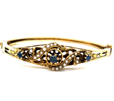Vintage 14k Yellow Gold Sapphire and Seed Pearl Bangle Bracelet