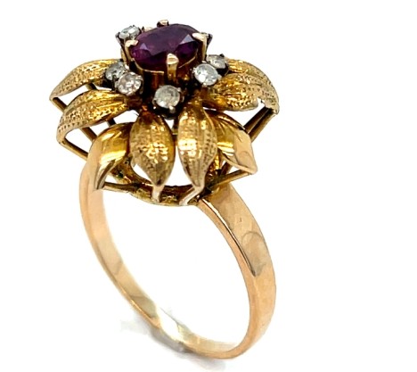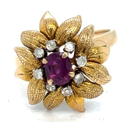 14k Yellow Gold Ruby and Diamond Leaf Cocktail Ring