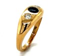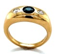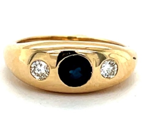 Elegant 14k yellow gold ring featuring one bezel set center round sapphire,