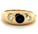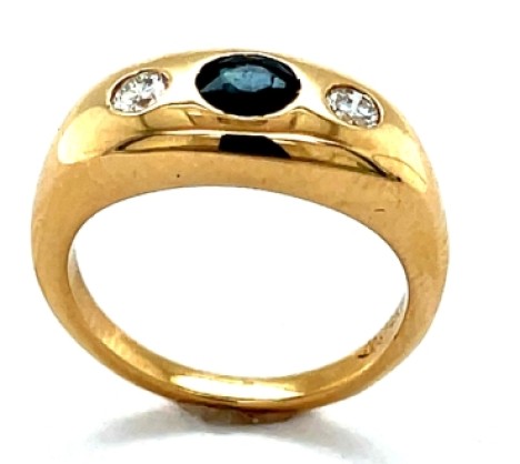 approx. 0.50ct, displaying a dark blue color, flanked by two bezel set round brilliant-cut diamonds
