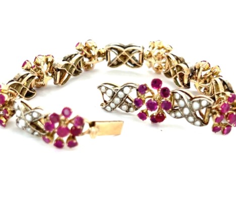 Vintage 14k Yellow Gold Ruby and Seed Pearl Bracelet