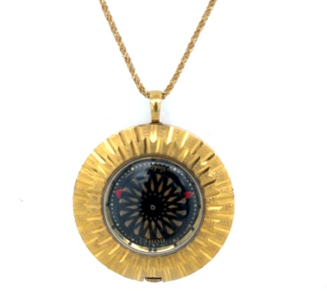 This rare Ernest Borel “Cocktail” manual-wind pendant watch from the 1960s features the iconic rotating kaleidoscope dial design.