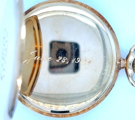 The back case is engraved “TGY” in script, with “June 28, 1927” engraved on the movement’s case.