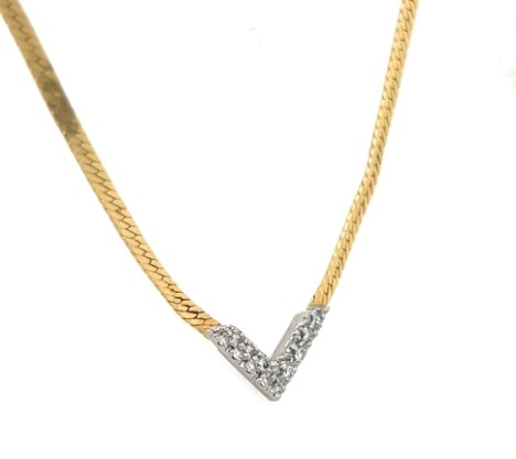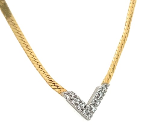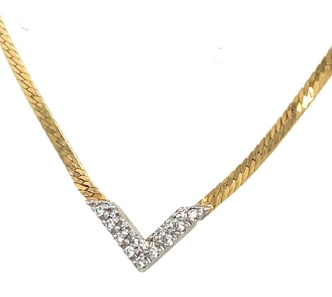 Delicate 14k yellow gold chevron “S” chain necklace measuring 16" long and set