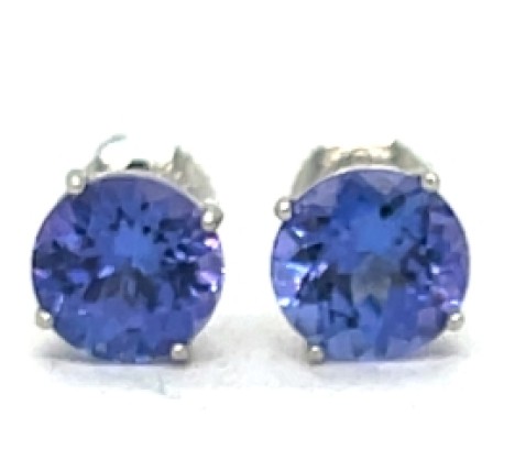 Delicate pair of 18k white gold stud earrings featuring two round faceted tanzanites,