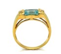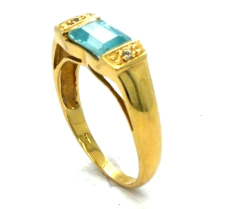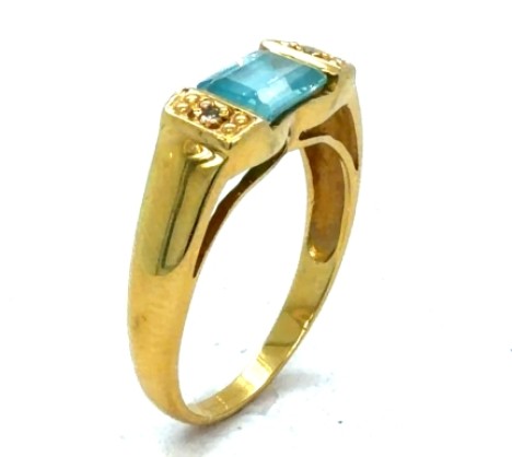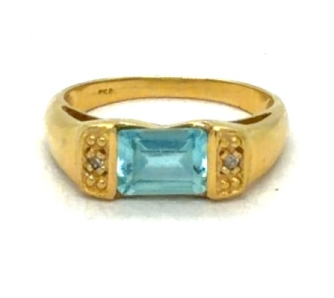 It showcases a 0.75 ct emerald-cut aquamarine with a pleasant light to medium blue color, accented by two full-cut diamonds