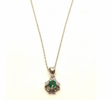 pendant. Emerald is surrounded by 4 straight baguettes set in a 4 prong setting weighing 0.23ct., G-H/VS