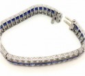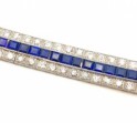 Presenting an exquisite Platinum Art Deco Diamond Bracelet featuring a captivating straight line design. This timeless bracelet showcases alternating rows of round brilliant diamonds and rectangular cut synthetic sapphires.