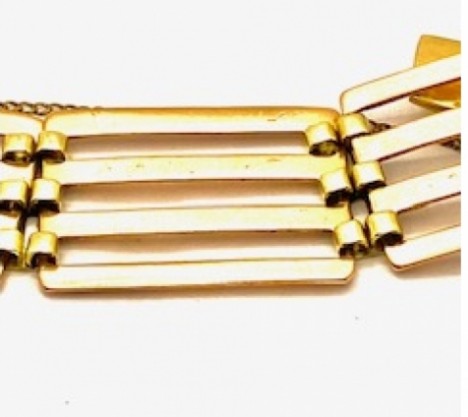 Art Deco 14k rose gold corral fence link bracelet, 7" length, 3/4" width, tongue clasp, base-metal safety chain, yellow gold dividers, 13.8 dwt.