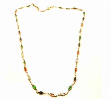 14K Yellow Gold Multi-Colored Stone Necklace with assorted bezel set marquise shaped semi-precious stones.