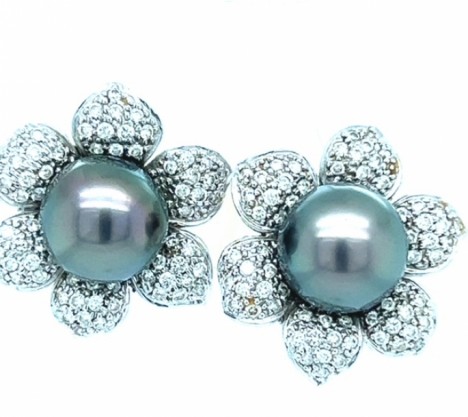 18K White Gold Black Pearl & Diamond Flower Earrings.