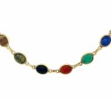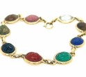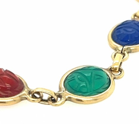 14k yellow gold multi-color stone scarab bracelet. This colorful bracelet is a true testament to the beauty of nature, featuring a collection of multi-color stone scarab charms.