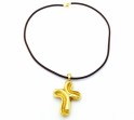 18K Yellow Gold Large Hallow Cross Pendant and 17" Brown Leather Cord, with