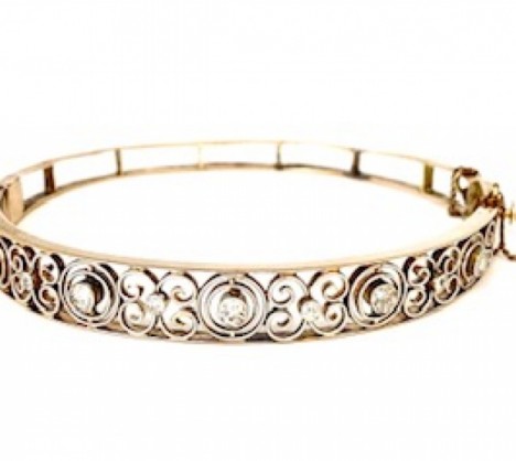 14K Yellow Gold and Platinum Art Nouveau Bangle Bracelet.
