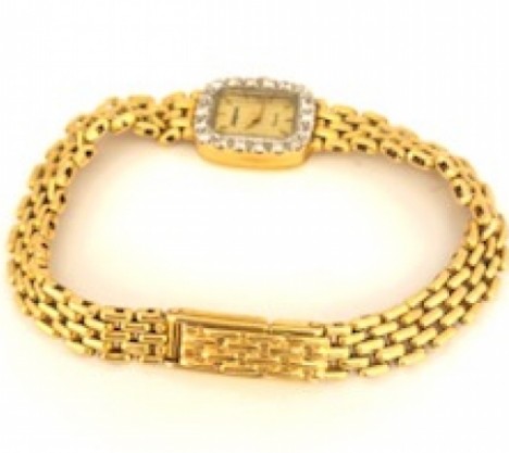 14K Yellow Gold Avignon Quartz Diamond Bezel Wrist Watch. Contains 18 round brilliant diamonds