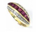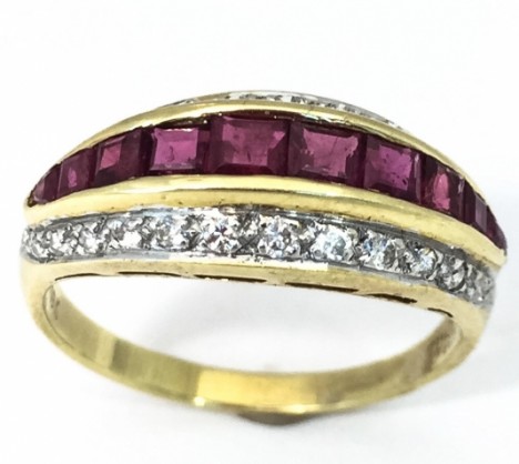 European 18K Yellow Gold Arched Ruby and Diamond Cocktail Ring with 8 square