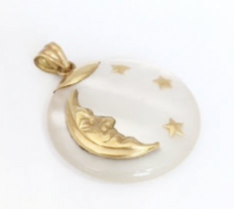 18K Yellow Gold and Mother of Pearl Pendant decorated with a crescent faced moon and stars.
