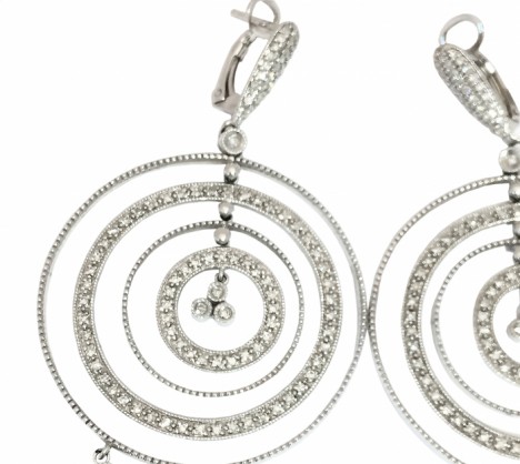 14K White Gold Diamond Multi-Circle and Tassle Hanging Earrings with +/-2.50cts. round brilliants,