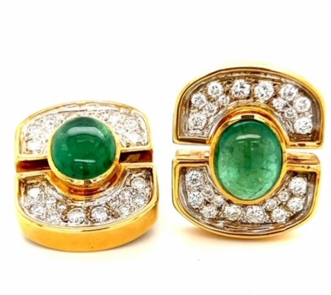 Elegant 14K Yellow Gold Cabachon Emerald and Diamond Earclips