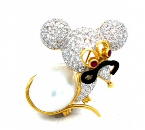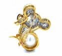 18K Yellow Gold South Sea Pearl Diamond, Ruby, and Black Enamel Mouse Pin,