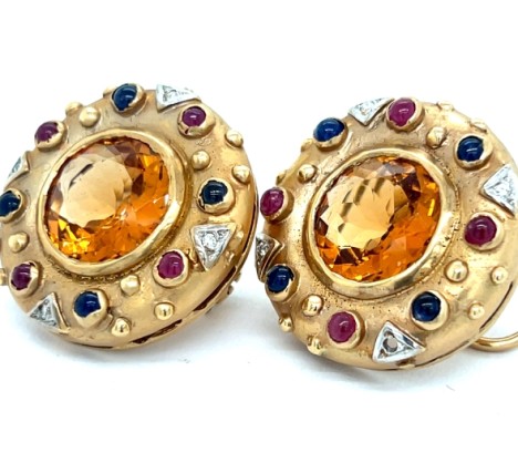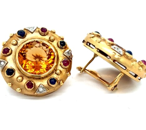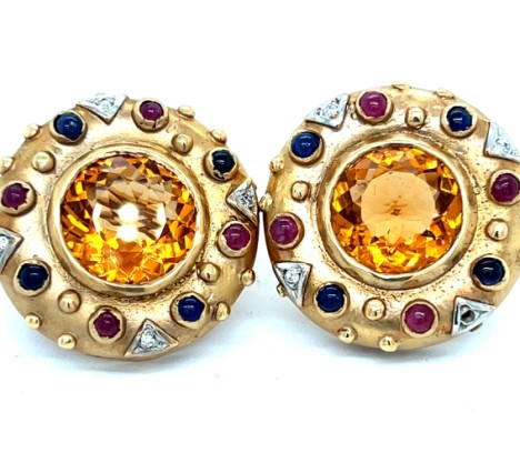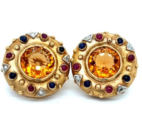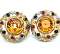 14K Yellow Gold Bezel Set Mult-Stone Large Round Earclips. Bezel set Cabachon Sapphire, Ruby, Diamonds, and