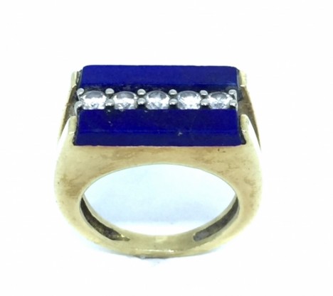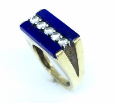 18K Yellow Gold Lapis & Diamond Cocktail Ring with 5 round brilliant diamonds totaling approx. .45ct., H/SI1 quality.
